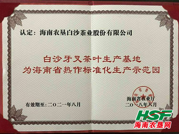 海南农垦网9月25日讯(通讯员 陆和)近日,海垦茶业集团下属单位白沙茶业公司白沙牙叉(白沙绿茶)茶叶生产基地被海南省农业厅认定为“海南省热作标准化生产示范园”,有效期至2021年8月。