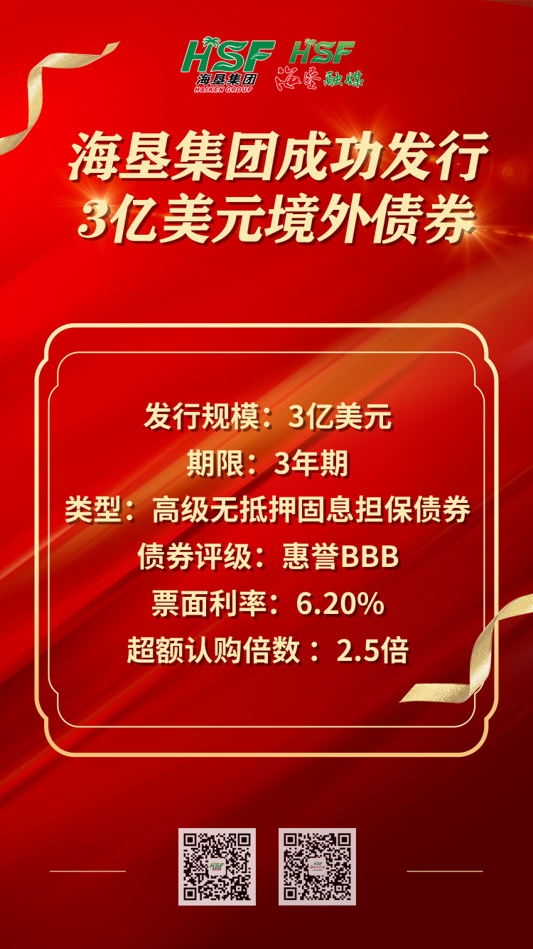 记者从海垦集团获悉,1月23日,海垦集团成功在境外资本市场发行3亿美元高级无抵押固定利率债券,期限3年,票面利率为6.20%,债券评级为惠誉BBB。