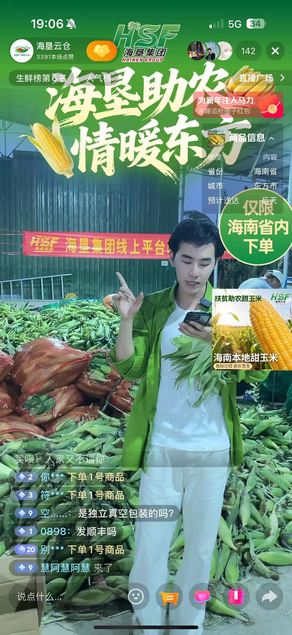 为破解东方市3万亩鲜食玉米销售难题,海垦供应链公司迅速响应海垦集团党委助农倡议,线上线下双向发力,全力助农纾困。该公司于2月28日在“海垦云仓”抖音平台启动玉米专场助农直播,同步在全平台上架鲜食玉米助农链接。截至3月1日,“海垦云仓”单场直播4个半小时,销售超4300单,共计3.2万斤鲜食玉米。