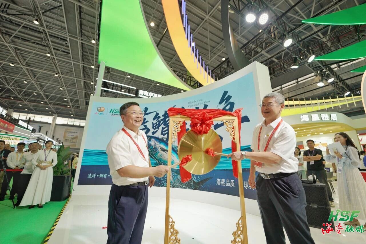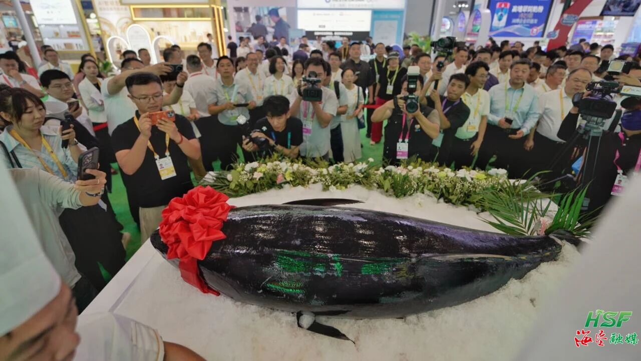 当天下午,包洪文、艾轶伦共同敲锣,宣布“开鱼仪式”开始,一条来自西班牙、重达360斤的蓝鳍金枪鱼在海垦馆内进行“开鱼秀”,引来现场一众参观者的围观拍照。专业师傅现场操刀,将整条蓝鳍金枪鱼精细分解,用这场融合了匠心和品质的视觉盛宴,向社会各界充分展现了海垦集团在深海养殖、渔业贸易的实力与影响力。