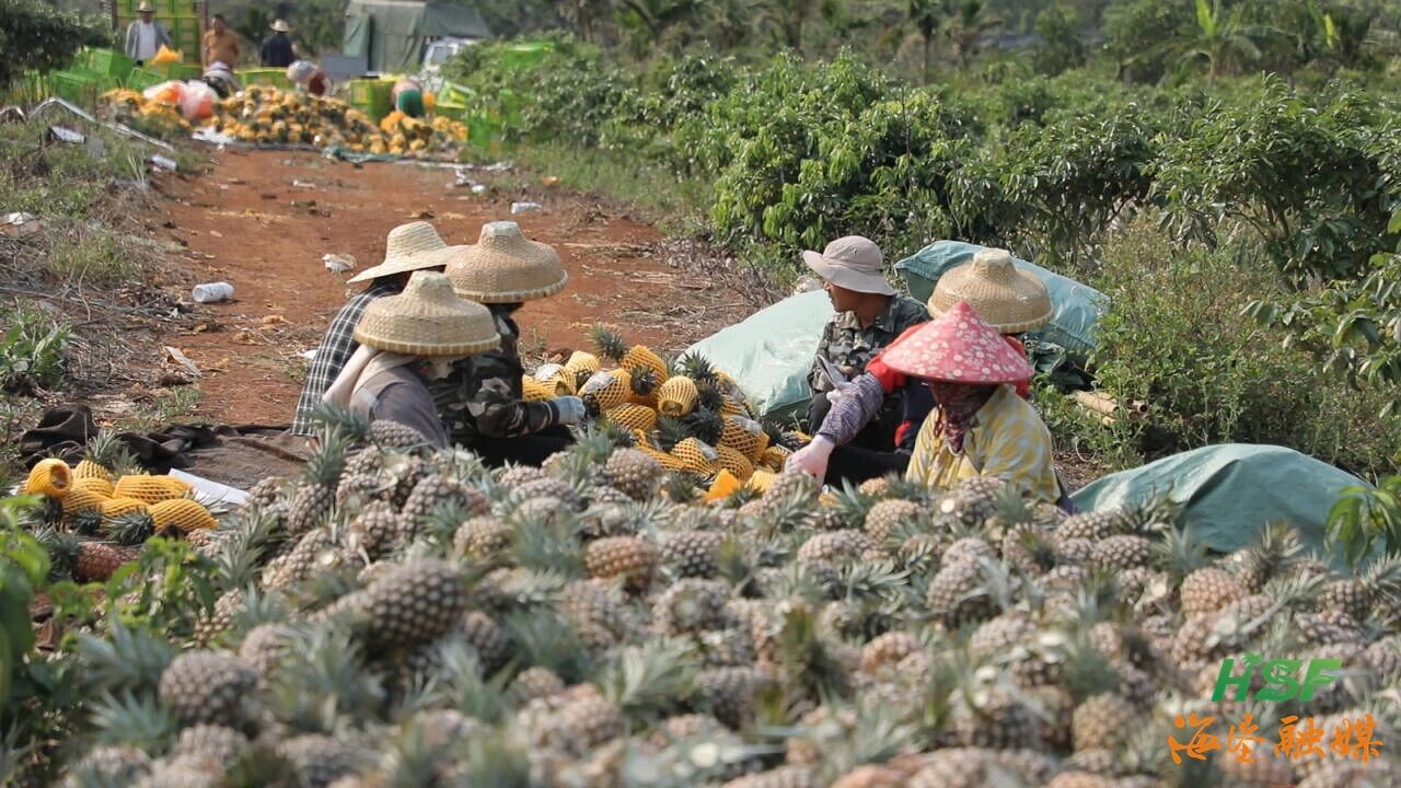 放眼田间,工人们穿梭垄间,手起刀落,“咔嚓”声中,一个个沉甸甸的凤梨落入箩筐。“人工采摘讲究‘火候’,必须2目至3目黄才能摘,这样的凤梨营养充足、果芯脆嫩、汁水清甜。”张建洪向记者介绍,凤梨采摘也要“看天吃饭”,遇上下雨天果子容易“上水”(水分太多过熟),糖度和运输都会受影响。