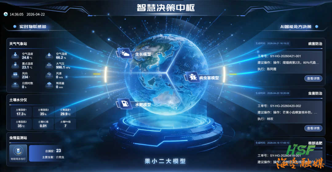 如今,在长田芒果示范基地,“果小二”的“智慧神经”已遍布全园。由气候监测站、虫情采集仪、性诱监测设备等组成的“空天地”一体化物联网,如同AI的“眼睛”“耳朵”,24小时实时采集气象、土壤墒情、虫口密度等多源数据,并将这些数据汇聚至“果小二”智慧决策中枢进行整合分析,精准捕捉果树的“声音”。