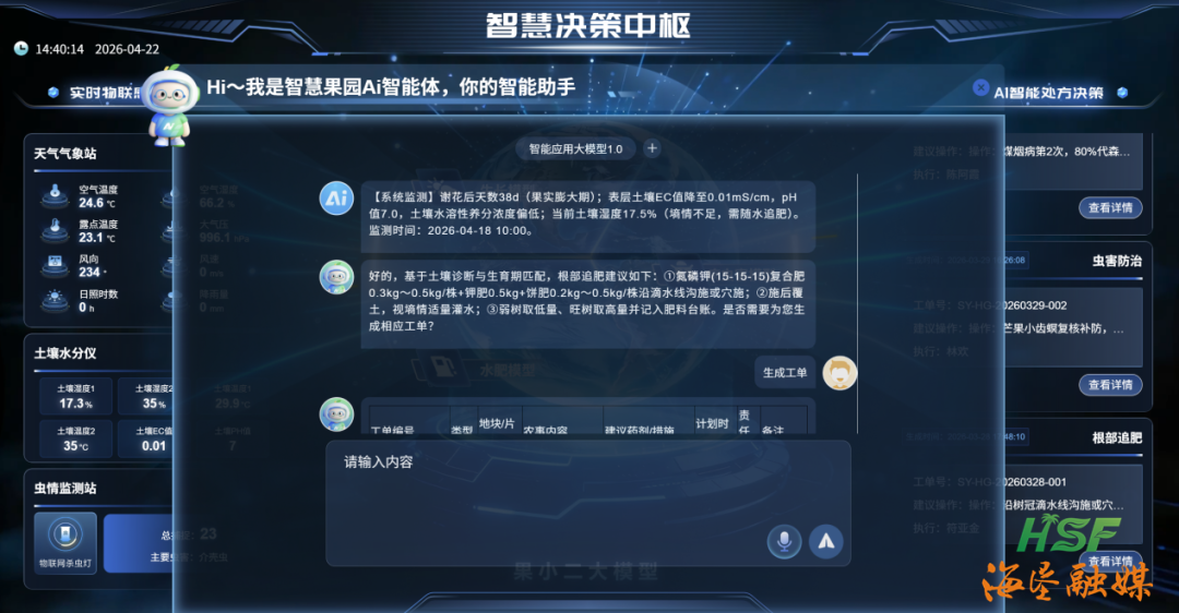 4月22日,在三亚市海棠区海垦神泉集团长田芒果示范基地,海垦科技集团旗下金垦赛博公司项目经理黎鹏打开“果小二”智能体,一条工单随即弹出,提示系统检测到土壤养分偏低、墒情不足,建议随水追肥,施后覆土,视墒情适量灌水。他点击“确认”后,远处的水肥泵房开始自动运转。